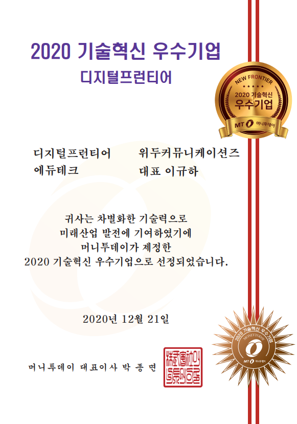 2020 기술혁신 우수기업 페이지 정보 작성자 WeDu 댓글 0건 조회 5,804회 작성일 21-12-31 12:58 본문 2020-12-21 2020 기술혁신 우수기업 디지털프런티어 에듀테크 머니투데이 대표이사 List Previous2020 소년한국 우수 어린이 도서 선정 21.12.31 Next2020 서울산업진흥원 2020 DMC어워드 21.12.31
