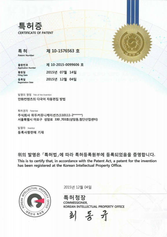 [한국/특허] 만화 컨텐츠의 다국어 자동 편집 방법 페이지 정보 작성자 WeDu 댓글 0건 조회 6,067회 작성일 19-05-30 18:49 본문 2015-07-14 특허 10-2015-0099606 만화 컨텐츠의 다국어 자동 편집 방법 List Previous[한국/특허] 전자서적과 연동되는 게임의 제공 장치 19.05.30