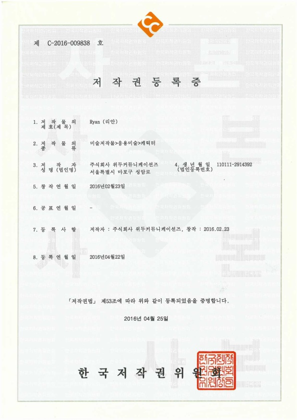 [한국/저작권] 리안 페이지 정보 작성자 WeDu 댓글 0건 조회 5,703회 작성일 19-05-30 19:08 본문 2016-04-22 저작권 C-2016-009838 리안 / 미술저작물>응용미술>캐릭터 List Previous[한국/저작권] 아리스 19.05.30 Next[한국/저작권] 나무트 19.05.30
