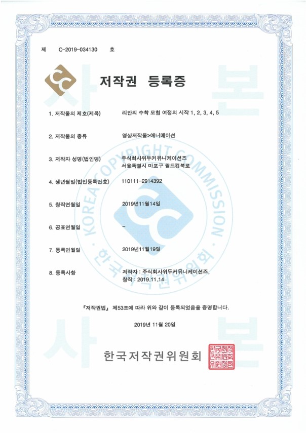 [한국/저작권] 리안의 수학 모험 여정의 시작 1,2,3,4,5 페이지 정보 작성자 WeDu 댓글 0건 조회 5,643회 작성일 21-12-31 12:36 본문 2019-11-20 저작권 C-2019-034130 영상저작물>애니메이션 List Previous[한국/저작권] OLL KIDS/MATH 21.12.31 Next[한국/저작권] 리안의 수학 모험 애니메이션 OST 19.11.25